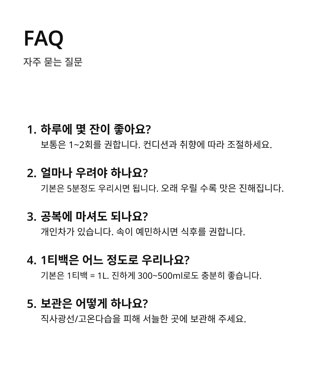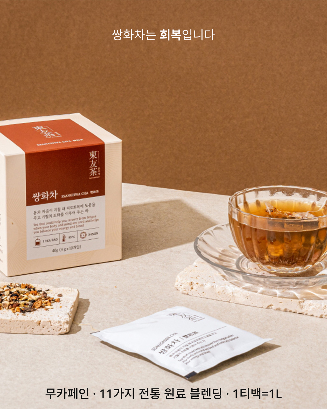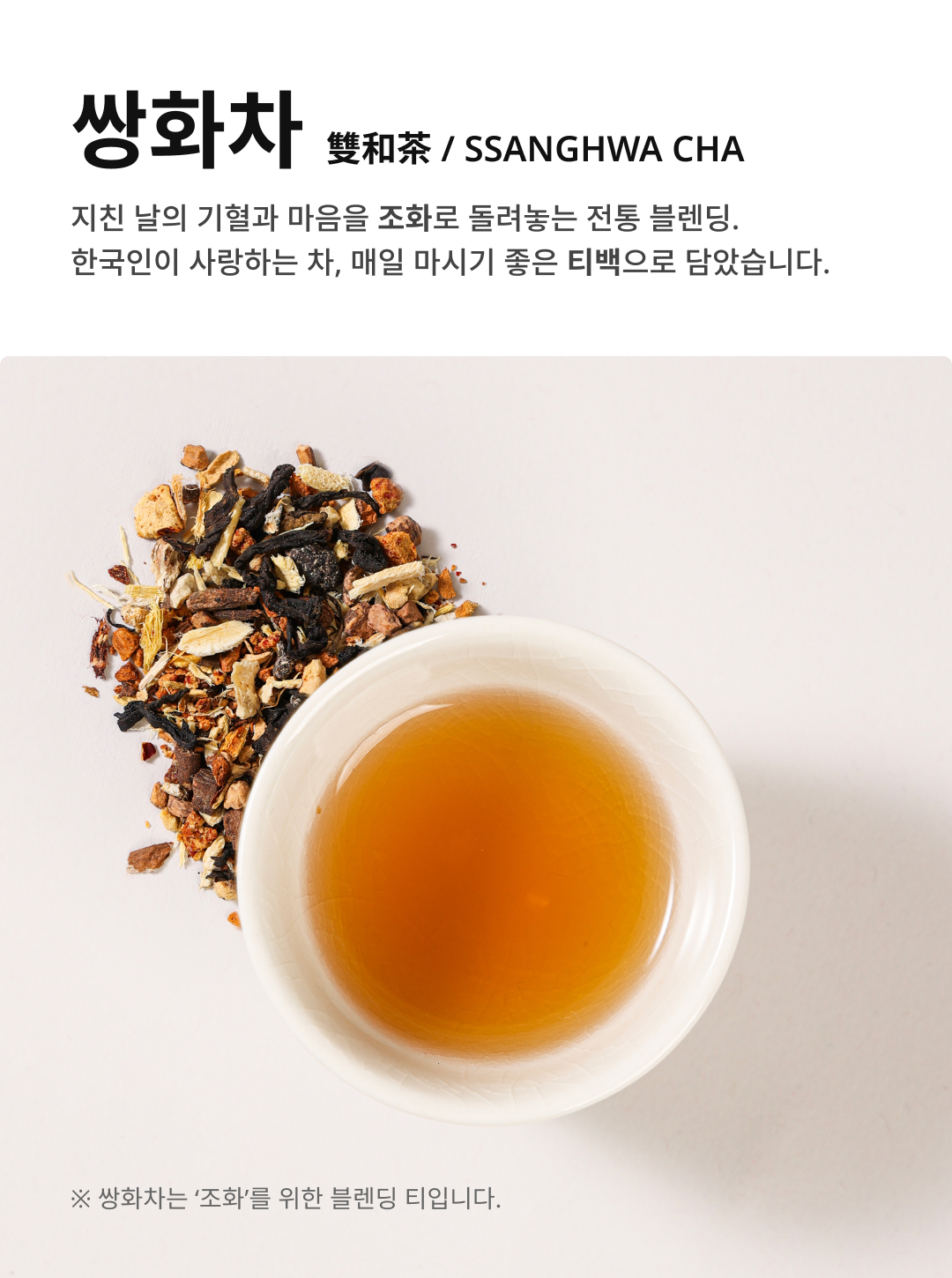11가지 정선된 전통 원료를 1L 대용량 티백에 담아, 온 가족이 깊고 진한 여운을 즐길 수 있습니다. 무카페인으로 하루 중 언제든 편안하게 만나보세요.